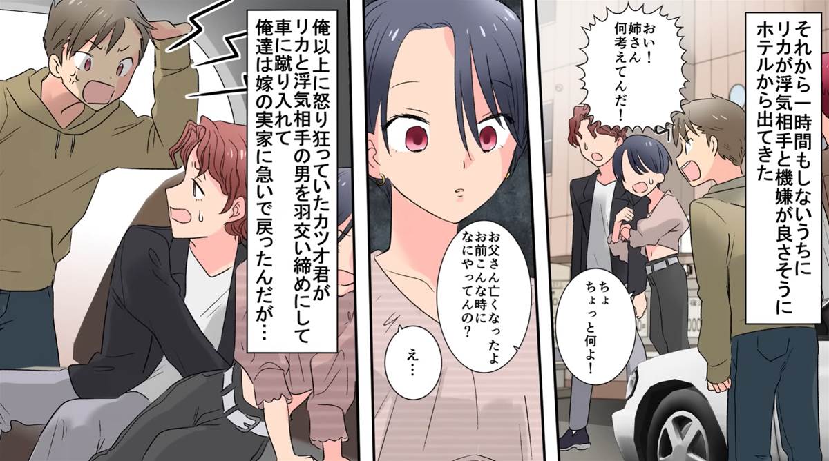 朝日は喪服を持ち、息子を連れて急いで理香の実家へ向かいました。義理の弟である彼とともに、理香がいつも通うホテルへ向かいました。そこで理香と浮気相手を確保し、無情にも理香に父親の死を伝えました。その時、理香はただ驚愕し、何も言えずにいたのです。
