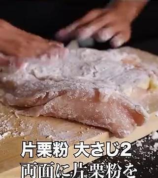 鶏むね肉は皮を下にしてまな板に置き、中央に包丁を入れて観音開きにします。厚みを均一にすることで、火の通りを揃え、焼きムラを防ぎます。ラップを肉の上に乗せ、すりこ木や麺棒などで力強く叩きましょう。こうすることで繊維がほぐれ、驚くほど柔らかな食感になります。ラップを外したら、両面に塩をふり、続いて片栗粉を満遍なくまぶします。片栗粉が旨味を閉じ込め、外はパリッと、中はジューシーな仕上がりに導きます。