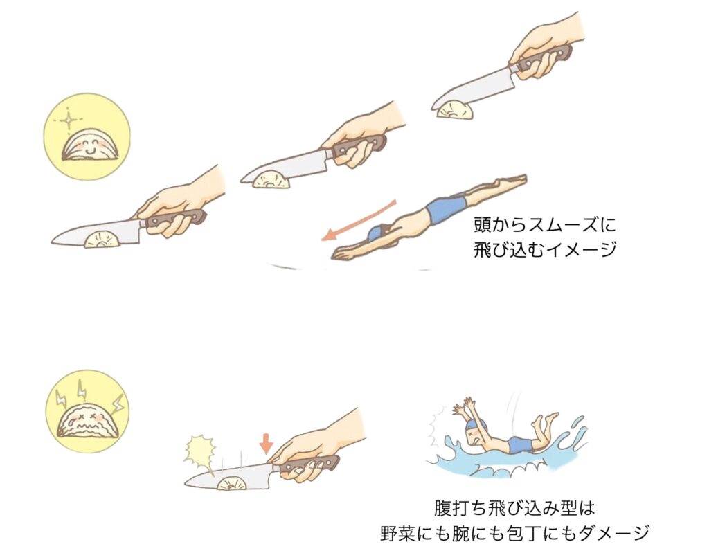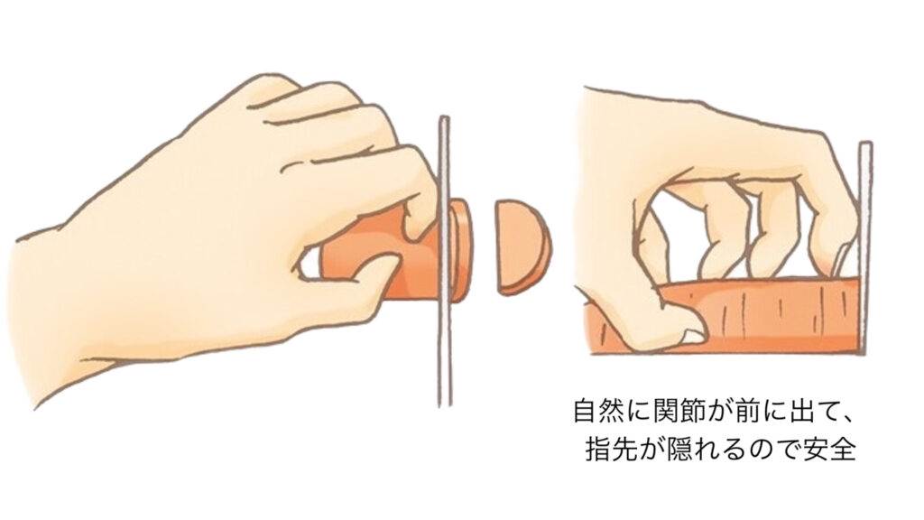 猫の手で作業を行うと、左手が一度一度止まってしまうため、連続した作業がしにくく、作業が遅くなります。しかし、指を軽く開いて添えることで、手を動かす際に無駄な停滞がなく、スムーズに次の作業に移行することができます。これにより、リズムよく作業を進めることができ、作業のスピードが向上するのです。