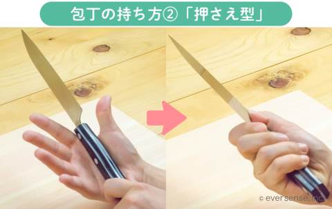 「押さえ方」は、固い食材を切るときに使用します。この方法では、包丁の柄をしっかりと握り、安定した力で切り進めることができます。具体的には、小指、薬指、中指で包丁の柄をしっかり固定し、親指と人差し指で包丁の刃を握る形になります。