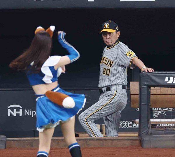 この対決が始まったのは、チームの応援マスコットガールがダンスパフォーマンスを披露している最中でした。鮮やかな青い衣装を身にまとった彼女が、ベンチ前で踊り始めると、その光景を見守っていたのが、阪神タイガースの岡田監督です。彼女のダンスが一際目立つ中、岡田監督の視線は一点に集中していました。その鋭い眼差しは、まるで「負けられない戦い」を挑んでいるかのように見えました。