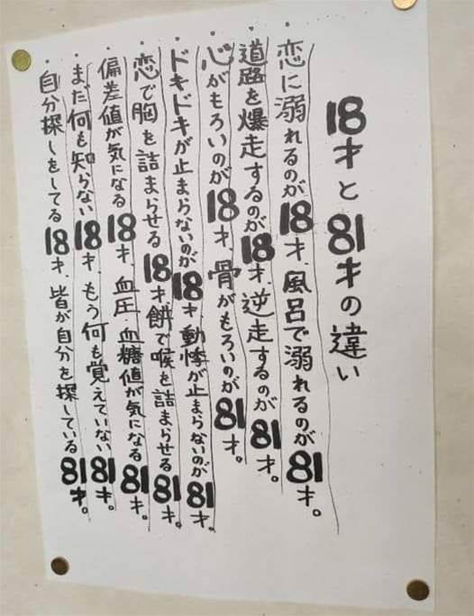 貼り紙には、8つの「18才と81才の違い」が書かれており、その内容はどれも思わず笑ってしまうものでした。