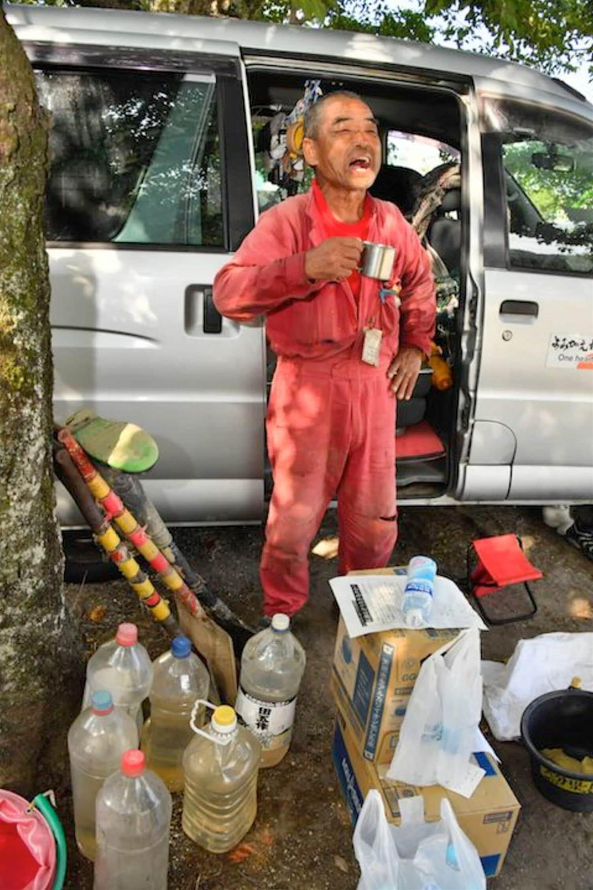 主食は持ち運びに便利なパックご飯とインスタントラーメンで、節約を徹底しています。また、軽ワゴン車の後部座席で寝泊まりし、普段からゴザの上で寝ることで、どんな環境でも快適に過ごせるようにしています。