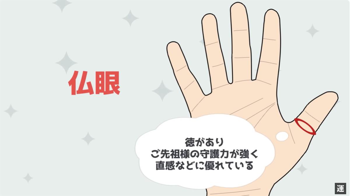 親指の第一関節に目のような形で現れる線で、強い霊感や直感力、スピリチュアルな分野での力を発揮する能力を持つとされています。物事を予知する能力があり、困難に直面しても乗り越えられる力を授かります。