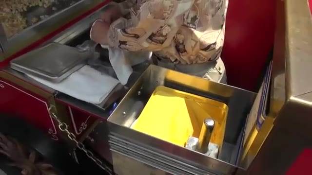 巨大なバターのブロックをスコップで掬い、熱々のポップコーンに豪快に混ぜ込む様子は、多くのゲストの目を釘付けにします。
