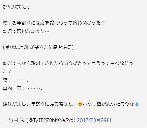 おばあさんは電車の座席に座るために乗車した。満員の中、幼児が立っている様子を見て、おばあさんは思わず言ってしまったのだろう。しかし、その言葉には嫌味が含まれていた。 幼児はおばあさんの言葉に驚き、しばらく言葉を失ったようだった。だが、少し経ってから幼児は冷静な表情でおばあさんに対して返答した。 「人から親切にされたらありがとって言うって習わなかったか?」