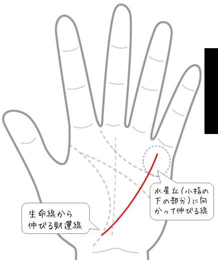 生命線の下部から水星丘に向かって、くっきり、はっきり、しっかりと一本線が伸びている場合、それは自分自身の努力によって財を得ることを示しています。