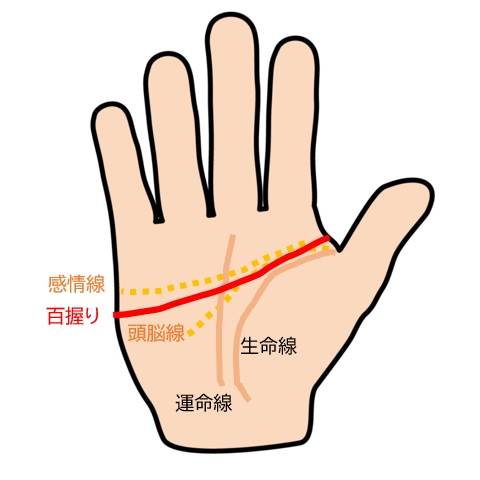 百握りの手相とは、感情線と頭脳線(知能線)がまるで運命の糸のように一体化し、手のひらを一直線に横切る形で現れる手相のこと。この線を持つ人は、粘り強く、天才肌で、そして何よりも強運の持ち主だと言われています。