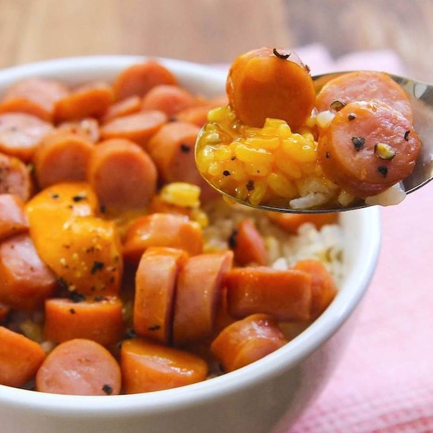 【レシピ:ソーセージのバター醤油麺つゆご飯】(1人分)