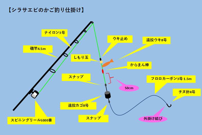 使用するタックルは、一般的に竿の長さは2.5メートルから3メートル程度で、しなやかな感度を持つものを選ぶのがベストです。