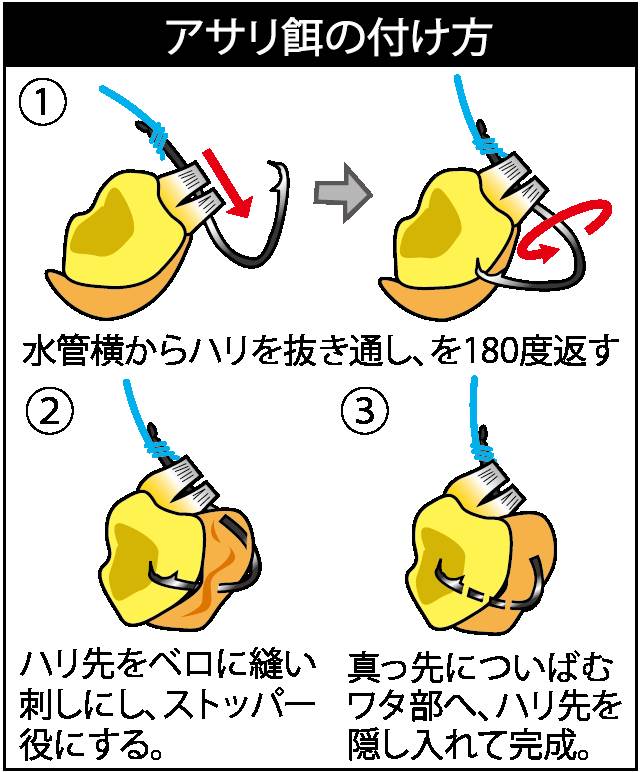 また、針先をガサ着門まで刺し、ベロの先端をしっかりと押さえることもポイントです。これにより、餌が外れにくくなり、カワハギが食いつきやすくなります。