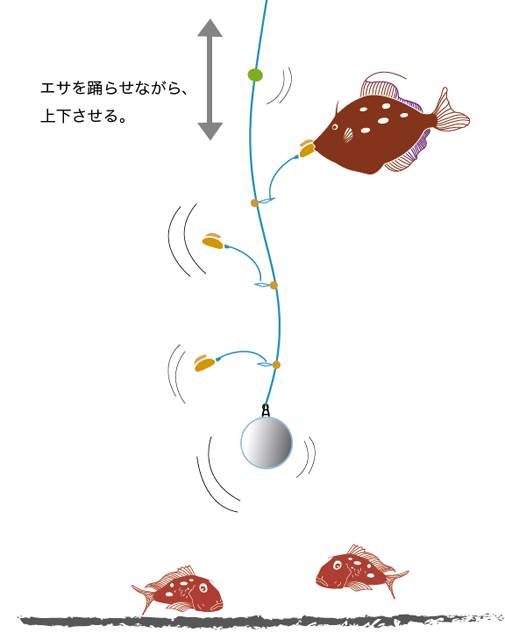 底をしっかりと取った後、ざっと下げて叩くことで、カワハギが寄ってきます。その後、引き合わせを行います。叩き下げの特徴としては、餌を自然に引き寄せることができるため、カワハギが浮いている場合でもしっかりと寄せることができます。
