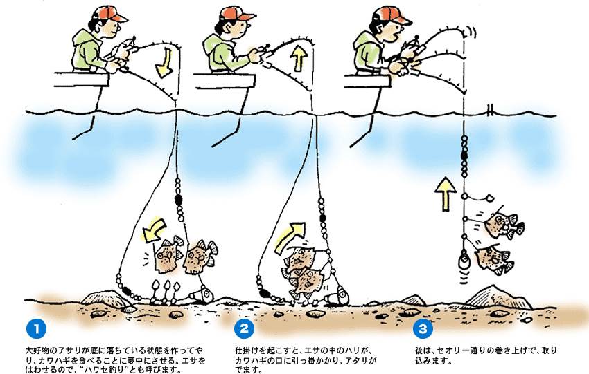 まず一つ目の方法は「叩き下げ」です。この方法では、仕掛けが底に触れた後、竿を下げながら叩くことでカワハギを誘います。この方法は力を使わずに、餌を自然にカワハギにアピールできるため、非常に疲れにくいです。