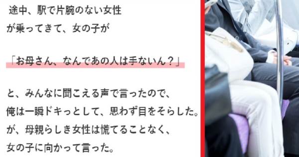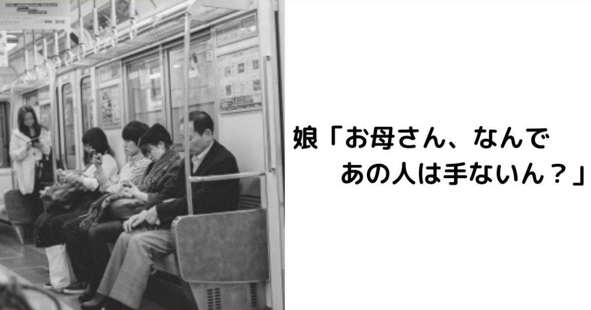 ある父親が電車の中で目撃した出来事について語っています。彼の娘は生まれた直後に母親が家を出てしまったため、母親のことをあまり話題にしないようにしてきたそうです。しかし、ある日の電車の中で、片腕のない女性が乗ってきて、その女性について娘が「なんであの人は手ないん?」と母親に尋ねたことがきっかけで、父親は子育てについて考えさせられる出来事がありました。