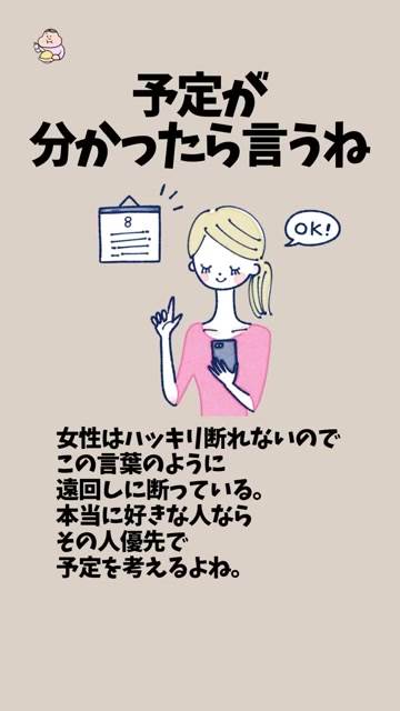 第四位:「予定がわかったら言うね」女性が明確に断ることを避ける場面でよく使うのがこの表現です。実際に予定があるのかないのかを考えるまでもなく、あなたとの約束を優先させるつもりはないということが示されています。本当に興味があれば、彼女は最優先で予定を調整するでしょう。