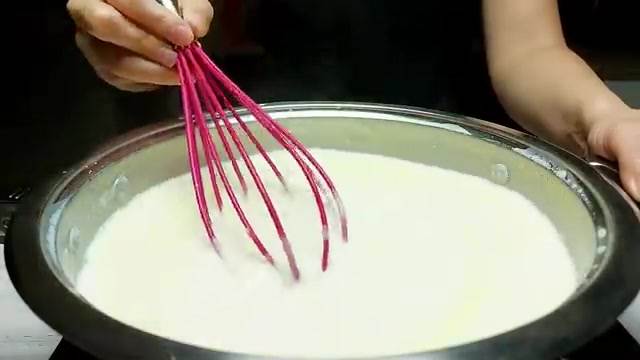 凝固剤の追加煮詰めたミルクに凝固剤(酢やレンネット)を加え、軽くかき混ぜます。この段階で、液体が固体に分離します。
