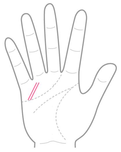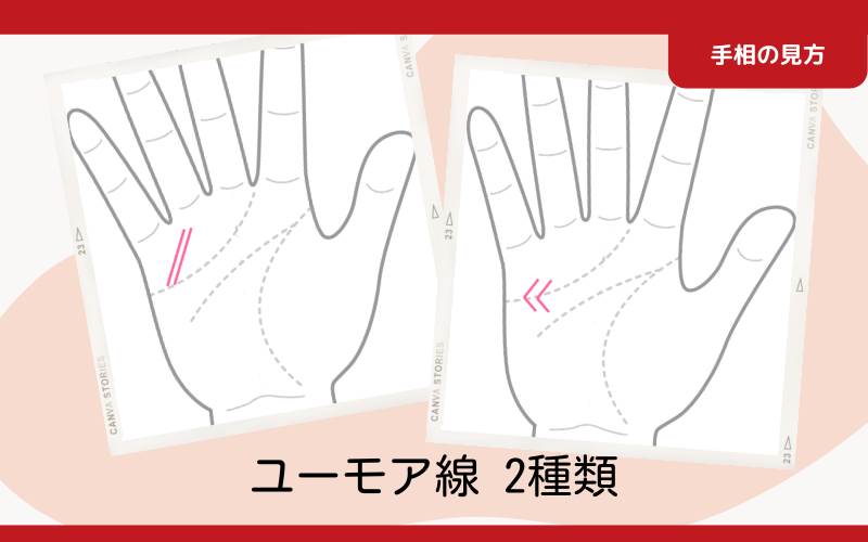 このタイプのユーモア線は、感情線の始まりの部分に、まるで笑っているかのような”く”の字の形で現れる。感情線の上下に線が現れ、その形状が”く”の字に見える場合、それがユーモア線となる。重要なのは、この”く”の字の開きが、手の内側に向いていることだ。もし外側(小指側)に向いている場合は、それはユーモア線ではなく、子宝線である可能性が高い。