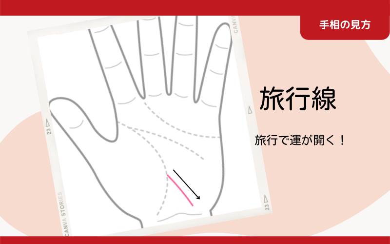 旅行線を持つ人は、生まれ故郷(実家)を遠く離れて暮らす運命にあるか、または実家を離れる期間があることを示しています。故郷を離れた場所で活躍する可能性を秘めていたり、積極的に旅行することで運が開けるタイプの人にも、この線が現れやすいとされています。