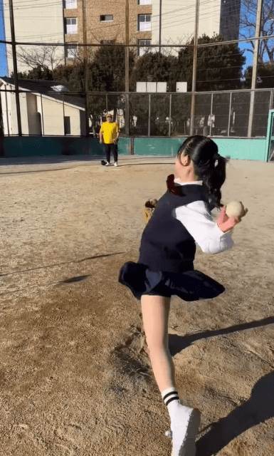 まりんが投げるボールは、彼女の練習の成果をしっかりと反映していた。制服を着たまま投球練習を行っているのは、彼女の中で「学校も野球も大事」という気持ちが強く、どちらも手を抜かないという強い意志の表れだ。制服姿で投げるそのボールは、意外にも力強く、正確だった。
