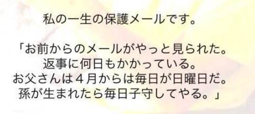「お前からのメールがやっと見られた。返事に何日もかかっている。お父さんは4月からは毎日が日曜日だ。孫が生まれたら毎日子守してやる。」