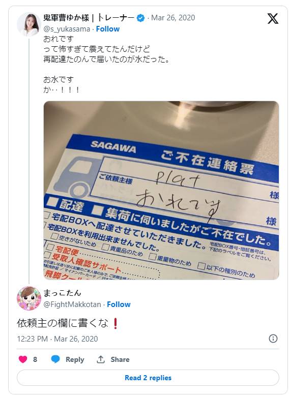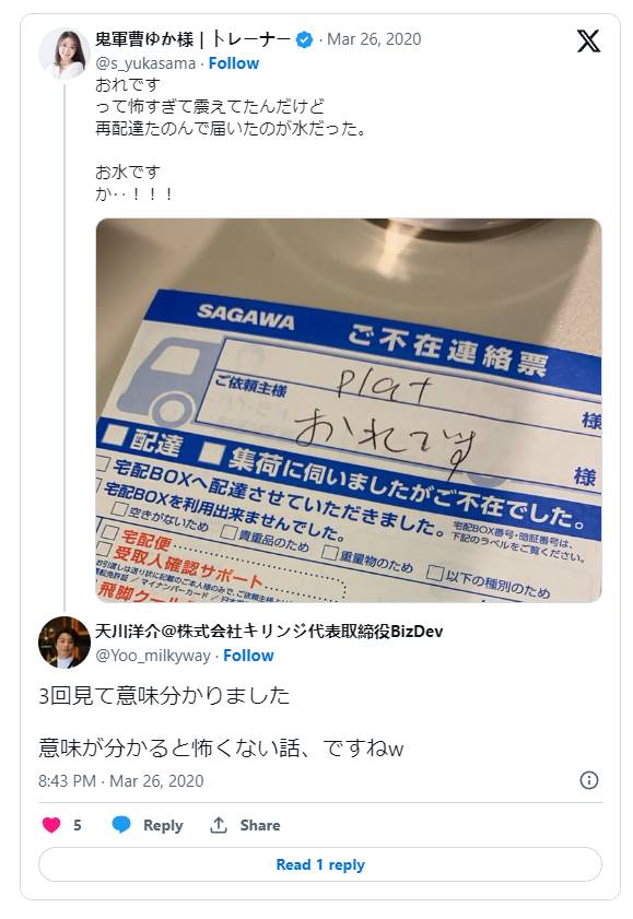 佐川急便からの不在票に書かれた『おれです』の文字…
