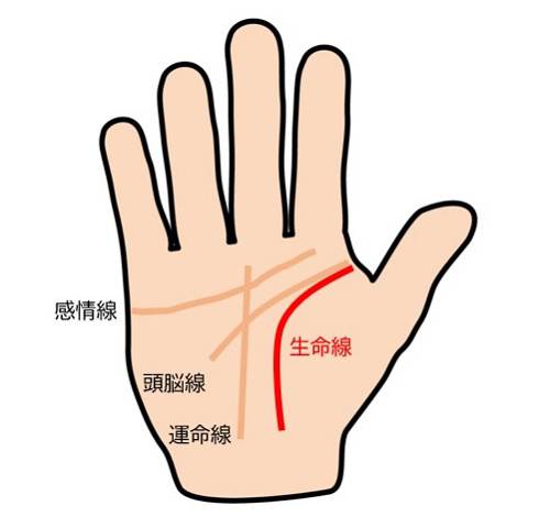 生命線は、人差し指の付け根と親指の間あたりから始まり、金星丘(親指の横のふくらみ部分)に沿って、手首の方に向かってカーブを描くように位置しています。生命線には、その人が持つ生命力や健康状態、体力・バイタリティ・スタミナといった心身の強さ、そして寿命の傾向などが表れます。