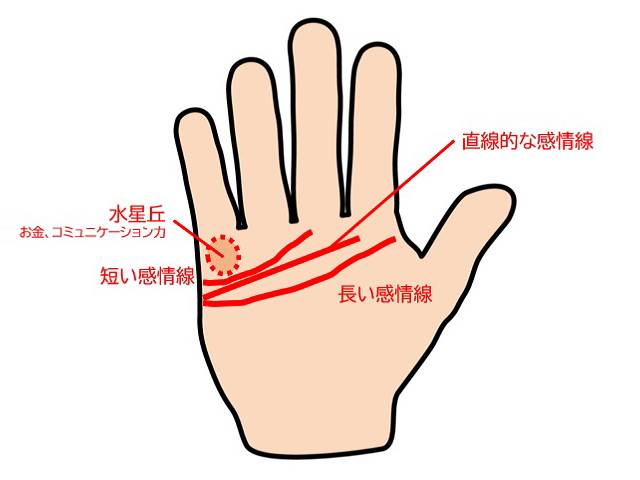 感情線が中指の下の膨らみ部分あたりまでしかない、あるいはそこにも届かない場合は、短い感情線と見なします。感情線の短さは、人の好き嫌いを示すと言われています。短い人は、苦手なタイプがハッキリしているようです。