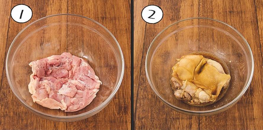 鶏肉の下準備 鶏もも肉にフォークで数カ所穴を開け、調味料が染み込みやすいようにします。耐熱ボウルに鶏肉を入れます。