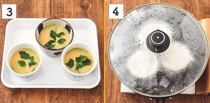 耐熱容器に注ぐ 濾した卵液を耐熱容器に注ぎ、刻んだ三つ葉を適量乗せます。容器の上にアルミホイルをしっかり被せてください。