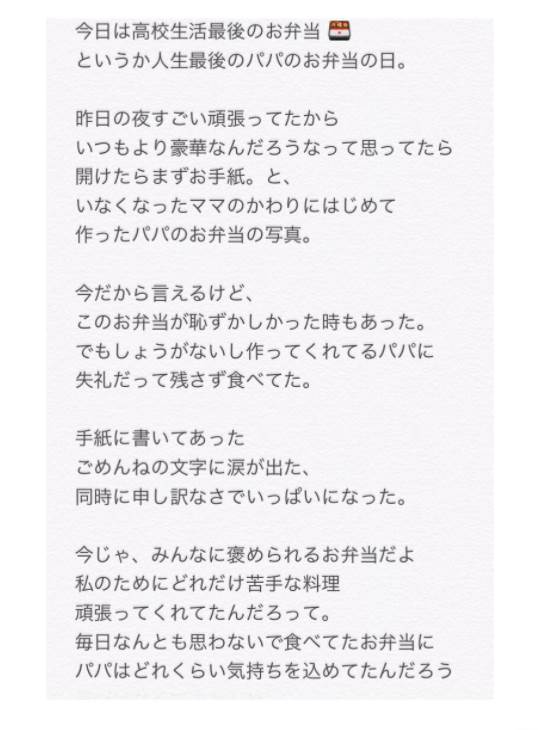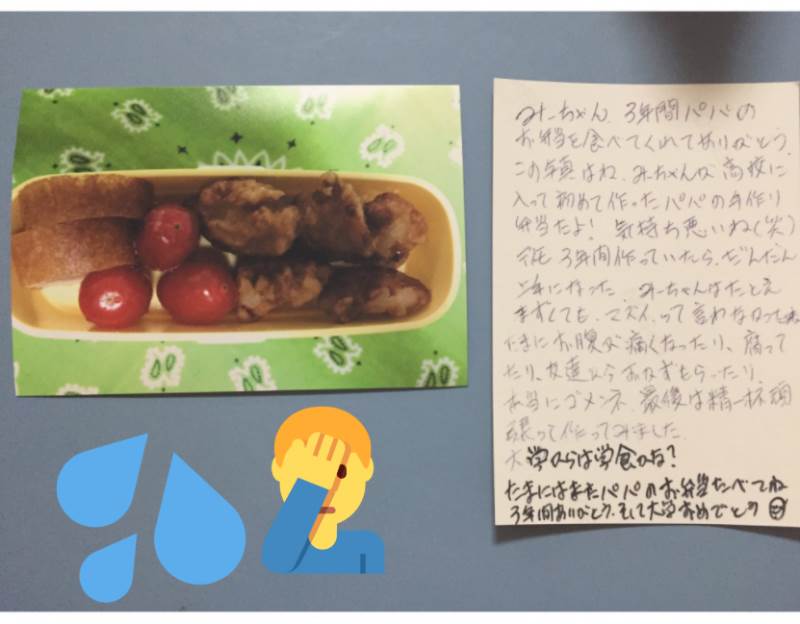 高校生活最後のお弁当に感謝の気持ちを伝えるツイートが話題となっています。特に注目されたのは、お父さんからの手紙と写真が添えられたお弁当です。お父さんが3年間にわたって作り続けたお弁当は、初めての頃から上達し、娘にとって特別な思い出となりました。手紙には感謝の気持ちとともに、お父さんが初めて作ったお弁当の写真が添えられています。