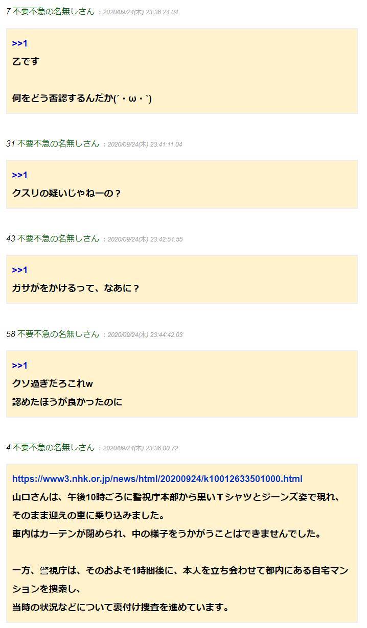 山口さんは、午後10時ごろに警視庁本部から黒いTシャツとジーンズ姿で現れ、そのまま迎えの車に乗り込みました。車内はカーテンが閉められ、中の様子をうかがうことはできませんでした。一方、警視庁は、そのおよそ1時間後に、本人を立ち会わせて都内にある自宅マンションを捜索し、当時の状況などについて裏付け捜査を進めています。