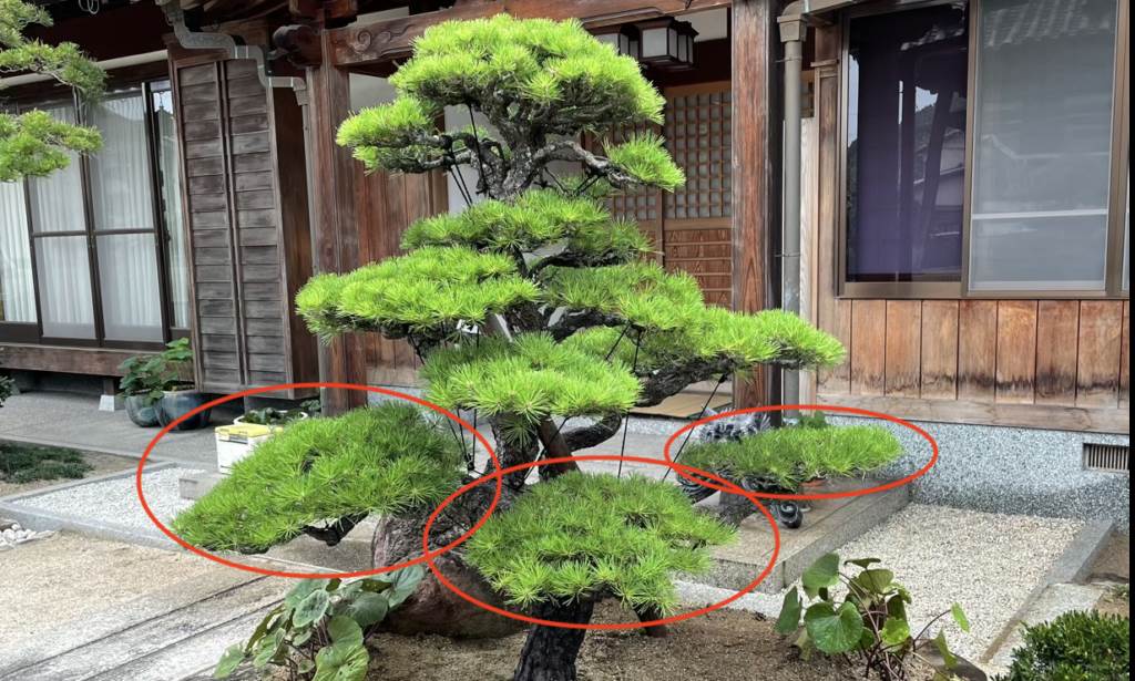 黒松は、上部の枝が日当たりが良いため、成長が早くなりがちです。そのため、上部はやや強めに剪定してバランスを取る必要があります。一方で、下部の枝は日光が届きにくく、成長が遅いため、剪定を控えめにするのが鉄則です。