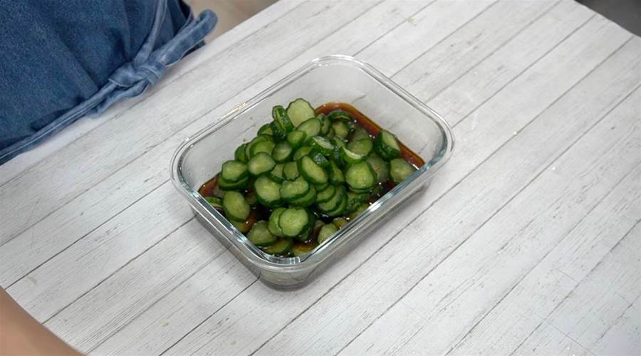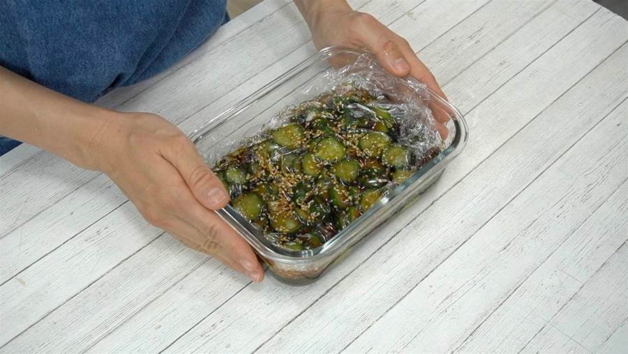 きゅうりを加え、再びレンジで600Wで2分加熱します。加熱することで、漬け汁がきゅうりにしっかりと染み込みます。