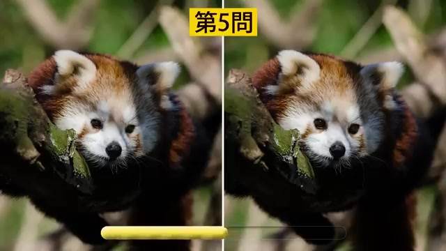 第5問。レッサーパンダの写真です。違いは1つだけです。スタート!どこが違うか見つけてみてください。タイムアップ!正解は、2枚目のレッサーパンダの目が大きいことです。