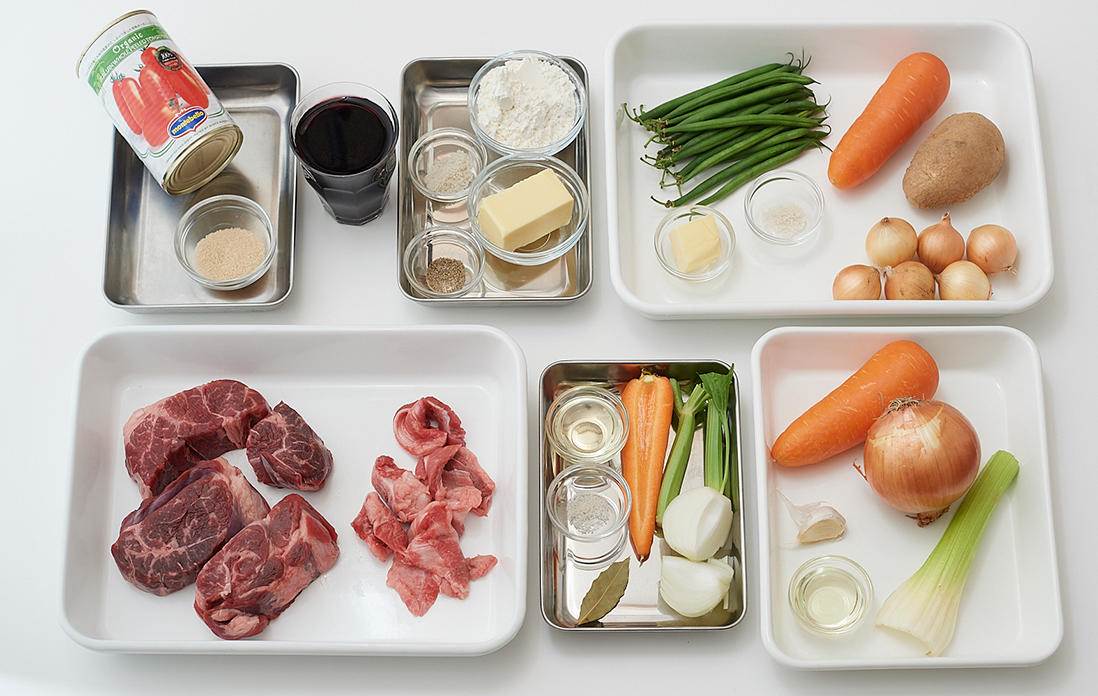 まずは、ビーフシチューを作るための材料を紹介します。今回は、肉は「切り落とし」を使用することで調理時間を短縮。一般的なビーフシチューに使うような分厚い肉を使わず、手軽に調理できる部分を選んでいます。また、白ワインを使うことで、味を軽めに仕上げつつ、深みを出すことができます。
