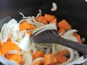 次に、オリーブオイルをひいたフライパンに、玉ねぎとにんじんを加え、強火で炒めます。ここでは、香味野菜がしっかりと炒められ、味のベースがしっかりと整うことがポイントです。この工程がきちんとできると、後のビーフシチューの味が格段に良くなります。玉ねぎが透明感を帯びてきたら、炒めるのを止め、少しオリーブオイルを拭き取っておきます。