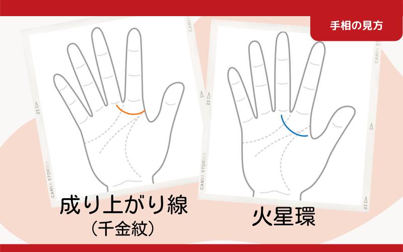 成り上がり線と火星環。どちらも、手のひらの親指側から中指の下、土星丘と呼ばれる場所に向かって伸びるという共通点を持つ。そのため、手相に詳しくない人が見ると、区別がつきにくいかもしれない。