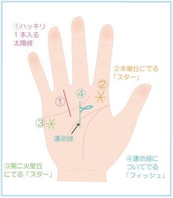 これらの相が全て揃っていることは、まずありません。太陽線が絶対条件で、第2火星丘または木星丘のどちらかにスターがあれば超ラッキー! さらに、フィッシュがあれば、これはもう宝くじ売り場に直行するしかありません!