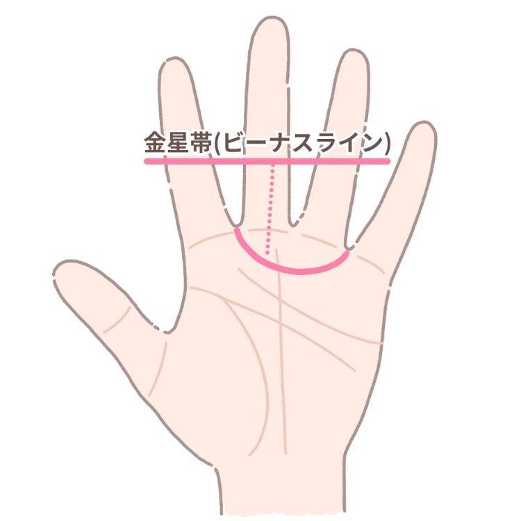 金星帯(ビーナスライン): 人差し指と中指の間から薬指と小指の間に半円を描く線。別名「モテ線」とも呼ばれます。