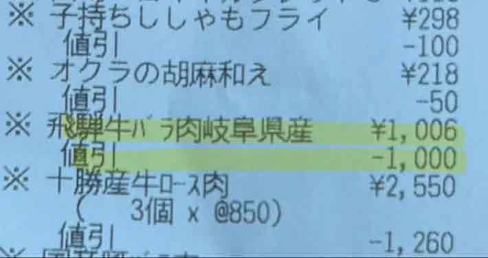 バスママさんが投稿した写真には、1006円から1000円が値引きされ、本体価格がなんと6円となった飛騨牛のバラ肉が映っていました。