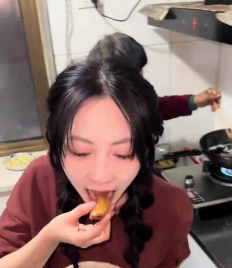 姥姥が少しキッチンを離れた隙に、外孫女は素早く行動に移した。テーブルの上に並べられた揚げ物を見つけると、誰にも気づかれないように、次々と手に取っては口に運んだ。