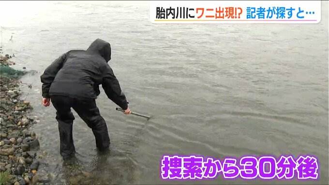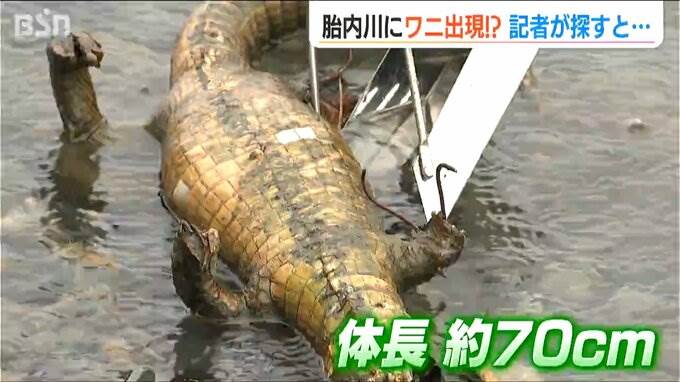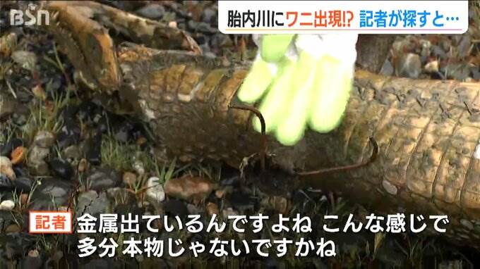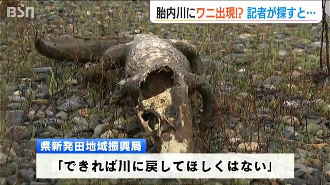 ワニの剥製が胎内川に。この謎の事態に地元の人は「ええ!これなんだあ!」と驚いた様子。「ワニのはく製」だと知ると…