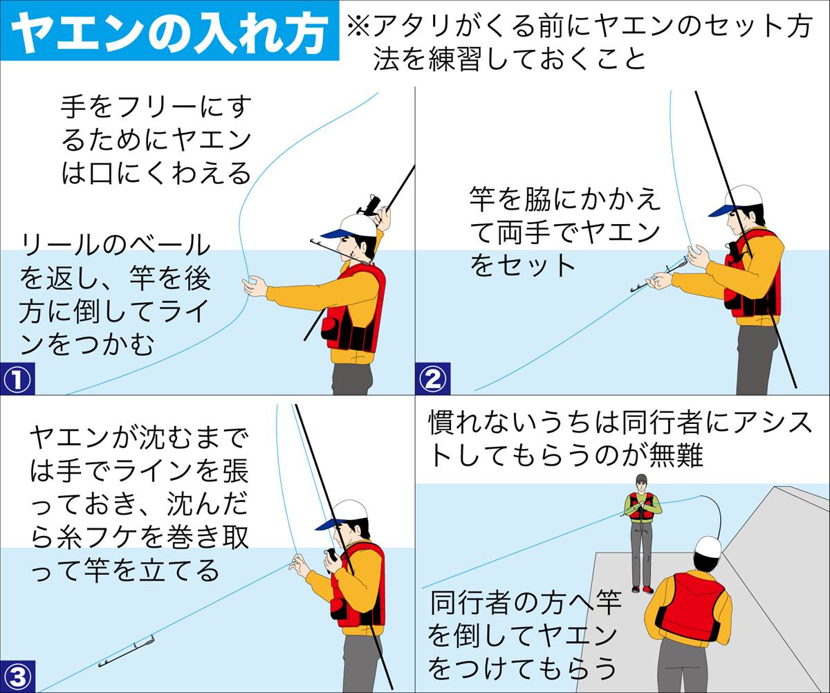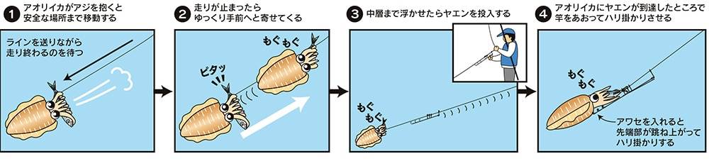 ヤエン釣りの基本的な流れは、まずアジを海に放ち、そのアジを餌にして烏賊を誘い出すというものです。