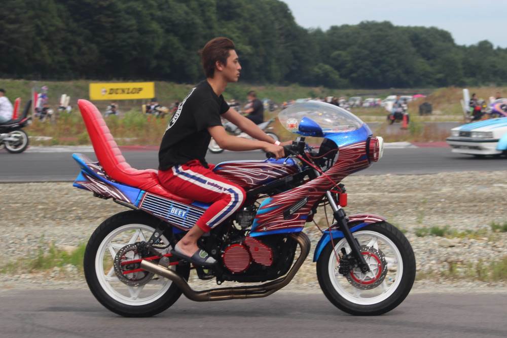 「族車といえばFX」と言われるほど、Z400FXは伝説の一台。この赤い車体に白いロングシート、高めのテール――改造バイクの王道スタイルであり、まさに“昭和族車の教科書”。