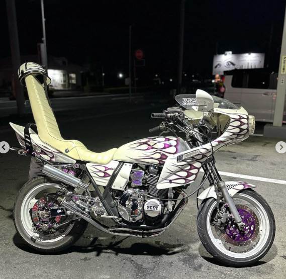 白×赤の落ち着いた色合いに、シンプルな直線的改造。無駄を削ぎ落とした硬派なルックスが魅力。派手さより“芯のあるかっこよさ”を求めるライダーに支持される仕様。