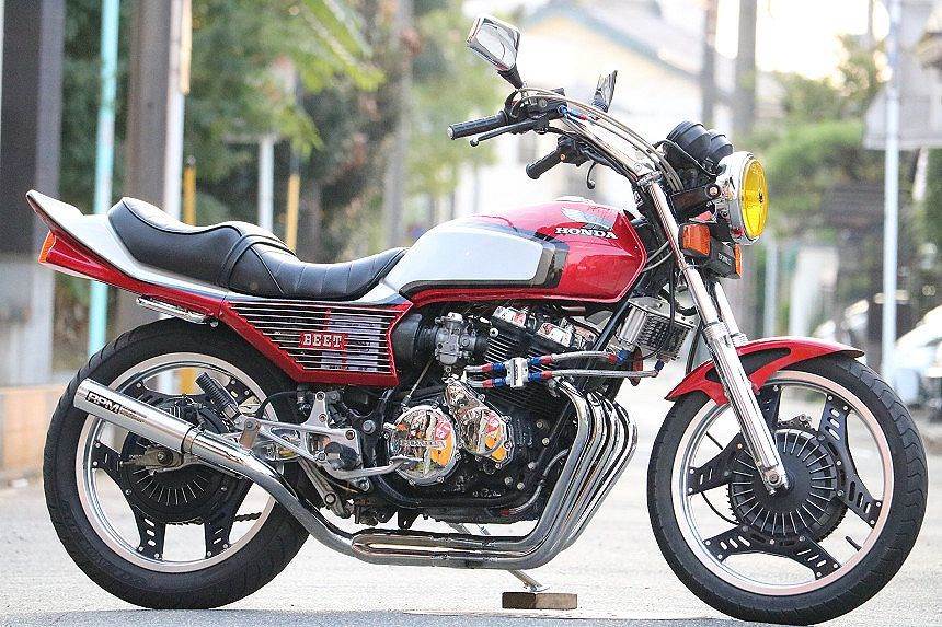 昭和後期の暴走族にとってCBX400Fは“バイブル”的存在。この赤×銀カラーにショートカウル、直管マフラー、旗立てまで完備された一台は、まさにリーダー格が乗るべき仕様。