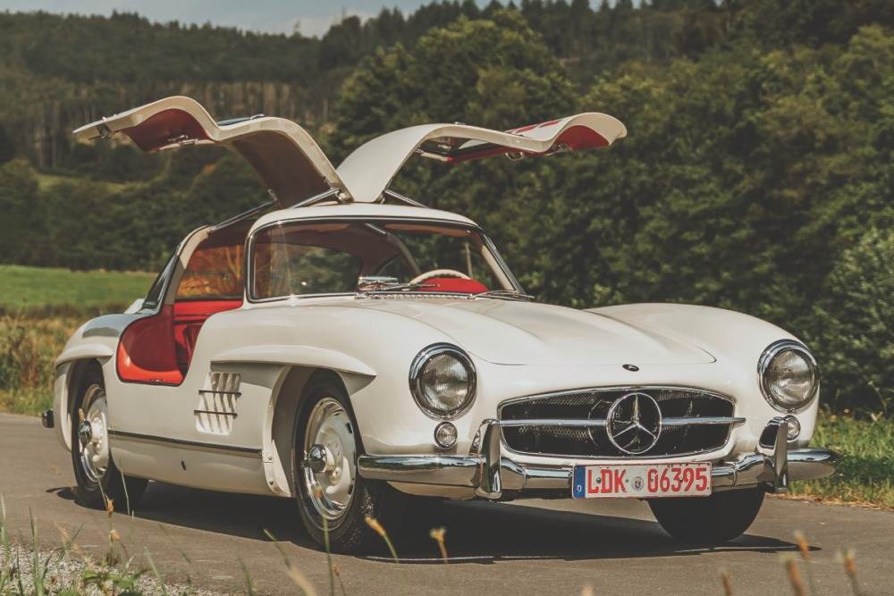 あの「ガルウィングドア」を世界に知らしめたのがこの300SL。当時としては異次元の最高速と、圧倒的な美しさを兼ね備えた伝説的存在。今でもオークションで高値がつく、まさに“走る芸術品”です。