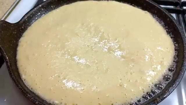 発酵が完了すると、いよいよフライパンで焼く段階に入る。アリはフライパンを中火にかけ、少量の油をひいた。そして、発酵させた生地を流し込む。フライパンの上で生地がふつふつと泡を立て、焼ける音が響く。