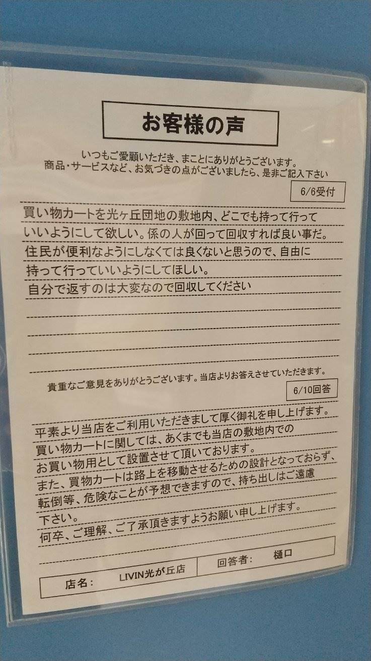 この店長の返答が掲示され、団地の住民たちはその内容に関心を寄せていた。カートの持ち出しに対しては悩みを抱えていた住民もいれば、店舗側の理解に感謝する声も聞かれた。将来的なカートの利用専用エリアの設置に期待する声もあり、住民と店舗の双方が協力し合ってより良い環境を作り上げていくことが望まれていた。