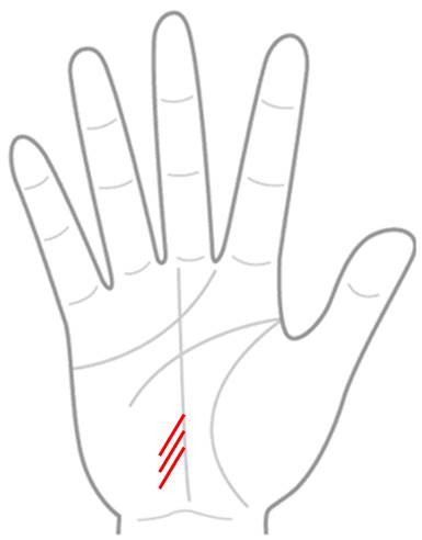 テ線(人気線)とは、運命線の下部、具体的には月丘側から運命線に向かって斜めに伸びる影響線のことを指します。通常、同じような角度と長さの影響線が3本程度現れることが多いとされています。